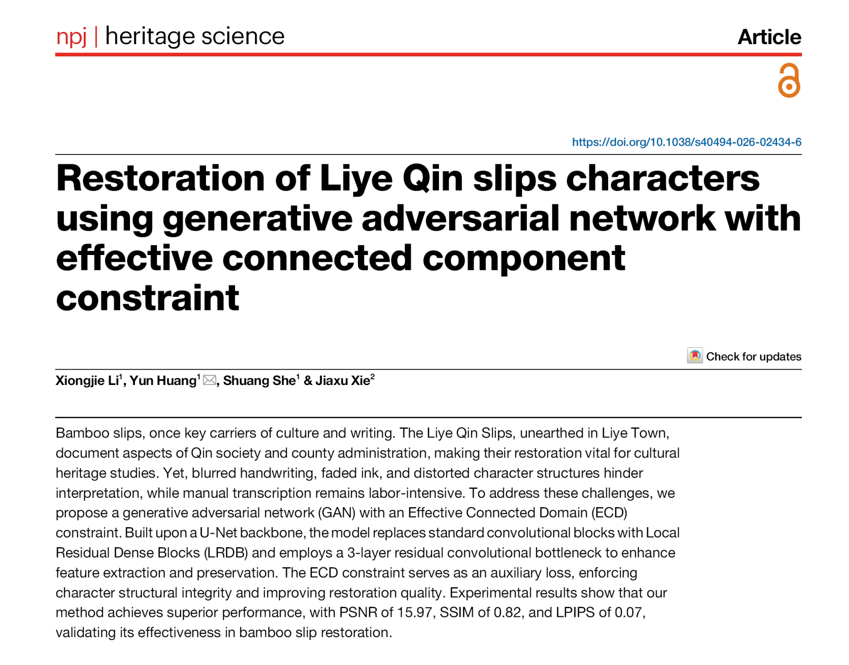 (计算机学院)近日,我院软件工程专业2023级本科生李雄杰在文化遗产国际顶级期刊《npj Heritage Science》发表题为“Restoration of Liye Qin...