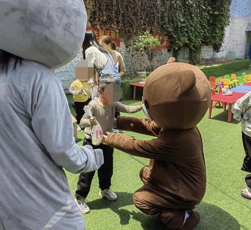 志愿者们在耐心引导小朋友们手工制作“妈妈的新发型”时,瞥见坐在旁边的妈妈们无不看着自己认真仔细的孩子露出了欣慰的笑容。两名志愿者穿上可爱的玩偶熊,以小朋友们喜欢的《猪猪侠》歌曲为背景音乐,跳起了舞蹈。舞蹈后两只玩偶熊给每个小朋友分发一袋小零食,并贴心地握握小手,弯腰来个熊抱,还没有领到小零食的小朋友激动地望着玩偶熊,当他们告诉身边的大哥哥大姐姐“我也想要小零食和玩偶熊抱抱”时,大哥哥大姐姐露出了温暖的笑容安抚着小朋友们激动的心情。