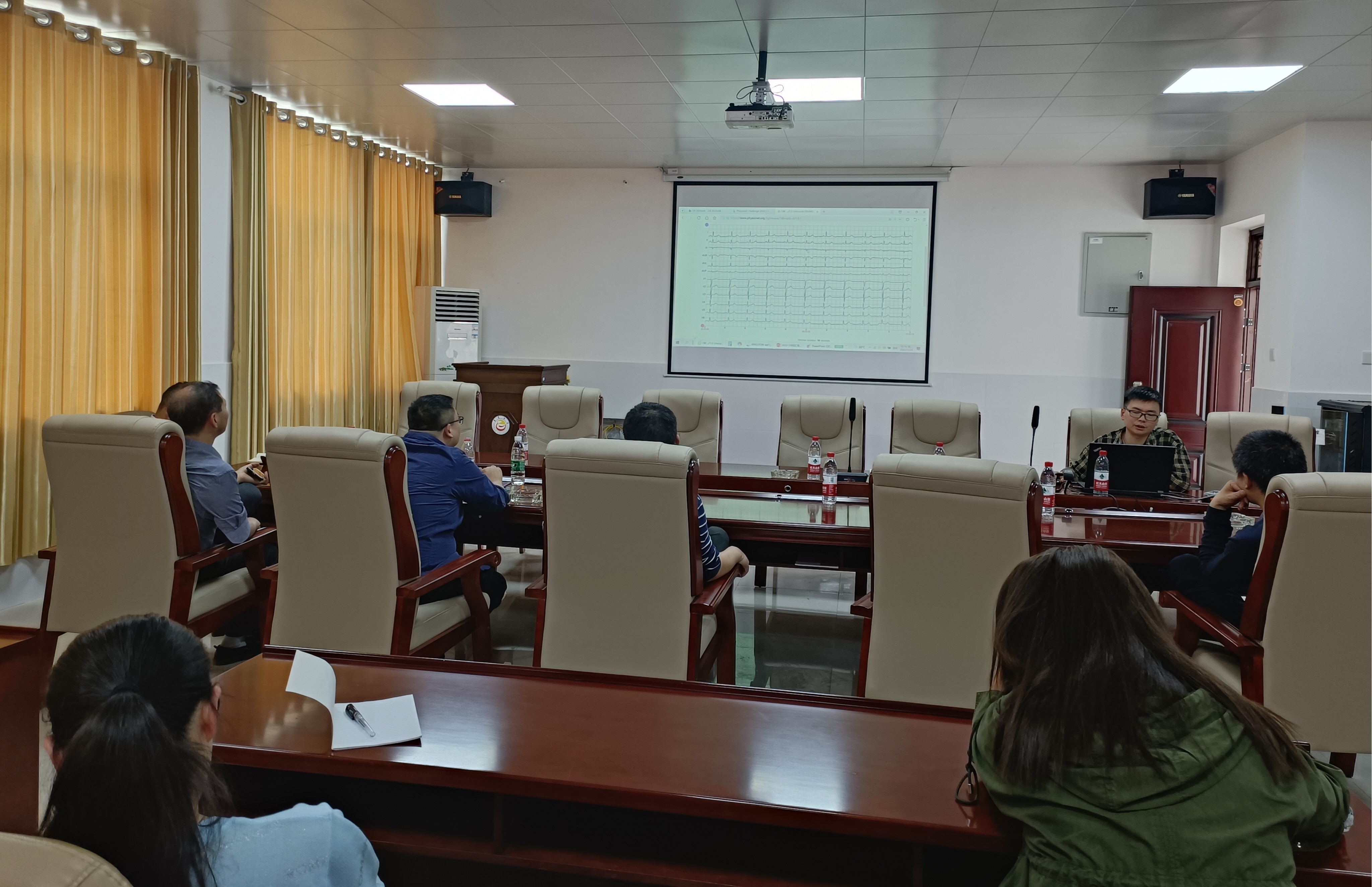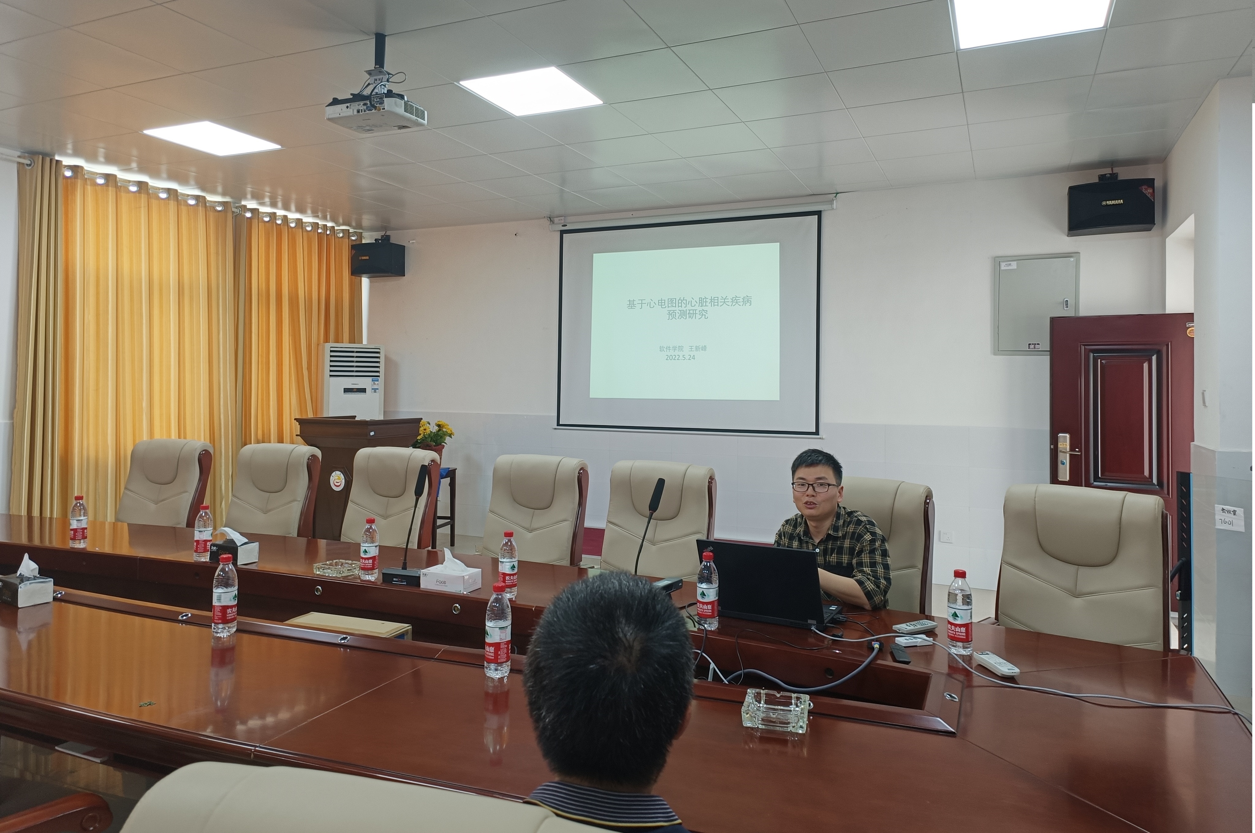会议室开展了学术沙龙活动,王新峰博士作了《基于心电图的心脏相关疾病的预测研究》的报告。之后,专业教师对该问题进行了研讨。