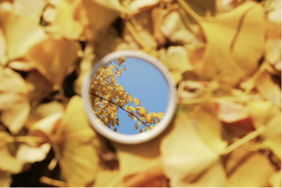 图片拍摄时作者巧妙利用镜像反射将树上未落的银杏叶和秋天落下的银杏叶摄入一张图片中,深秋最美不过银杏,镜中的蓝天映得金黄的叶更加动人。