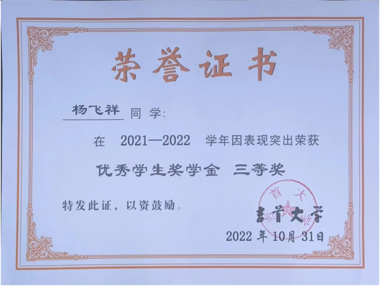 此外,他还获得了4项国家级软件著作权,相关作品涉及算法库开发、智能调度系统设计及数据可视化平台搭建等内容,进一步体现了他将理论知识应用于实践问题解决中的能力。在学术竞赛方面,杨飞祥同样表现突出,多次获得校级优秀学生奖学金,他曾代表学校参加蓝桥杯程序设计竞赛等多项赛事,并取得优异成绩,体现了扎实的专业技能与良好的团队协作精神。