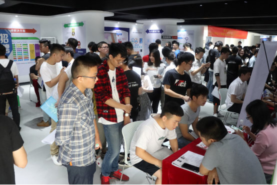 德创智谷一楼展厅内人头攒动,二百多名学生在这里寻找一份自己满意的offer,想为自己谋得一个美好的未来。在每个企业的展台前都排起了长龙,企业的HR们面对同学们的询问,耐心地解答应聘同学的疑惑。同学们拿着准备好的简历,满怀期待的在一家家企业展台前浏览。